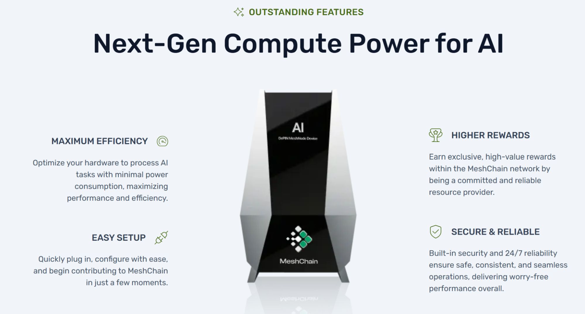 MeshChain 节点是专为 AI 任务设计的高效计算设备。这些设备以优化性能为目标,允许用户以低能耗贡献计算资源,同时提供出色的计算能力。节点的安装和使用非常方便,只需插入设备、完成配置,即可在几分钟内开始贡献资源。凭借全天候的稳定性和内置的安全功能,用户可以轻松参与 Meshchain 网络,既能获得无缝的使用体验,又能享受安心保障。此外,用户还可以通过贡献资源和保持节点在线时间获得专属奖励。对于希望获得被动收入并支持去中心化 AI 生态的个人或企业来说,MeshChain 节点是一个明智的选择。