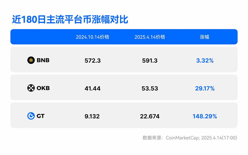 平台币的价值表现本质上反映交易所的综合竞争力。从近180天的涨幅数据来看,GT以148.29%的涨幅远超BNB(3.32%)与OKB(29.17%),这一差距揭示了三个核心趋势:
