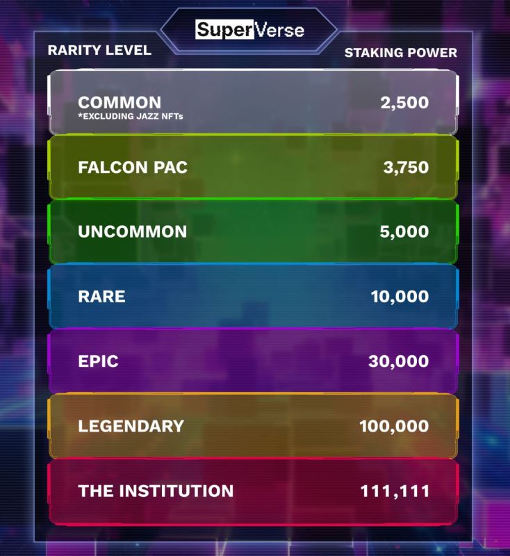 SuperVerse 的 DAO 质押系统正在持续发展,特别是近期关于 NFT 提升和 GEM 转换机制的变更。来自 EllioTrades 和 SuperFarm Genesis NFT 的 NFT 质押能力会影响质押奖励,但不会影响 DAO 的投票权,从而保持 SVIP 1 中提出的“一枚 SUPER、一票”原则。为了与 DAO 质押者框架保持一致,NFT 提升功能已重新校准,采用封顶的堆叠数值,取代基于百分比的逻辑。这种方式允许更加包容和平衡的奖励生成,同时不扭曲治理影响力。