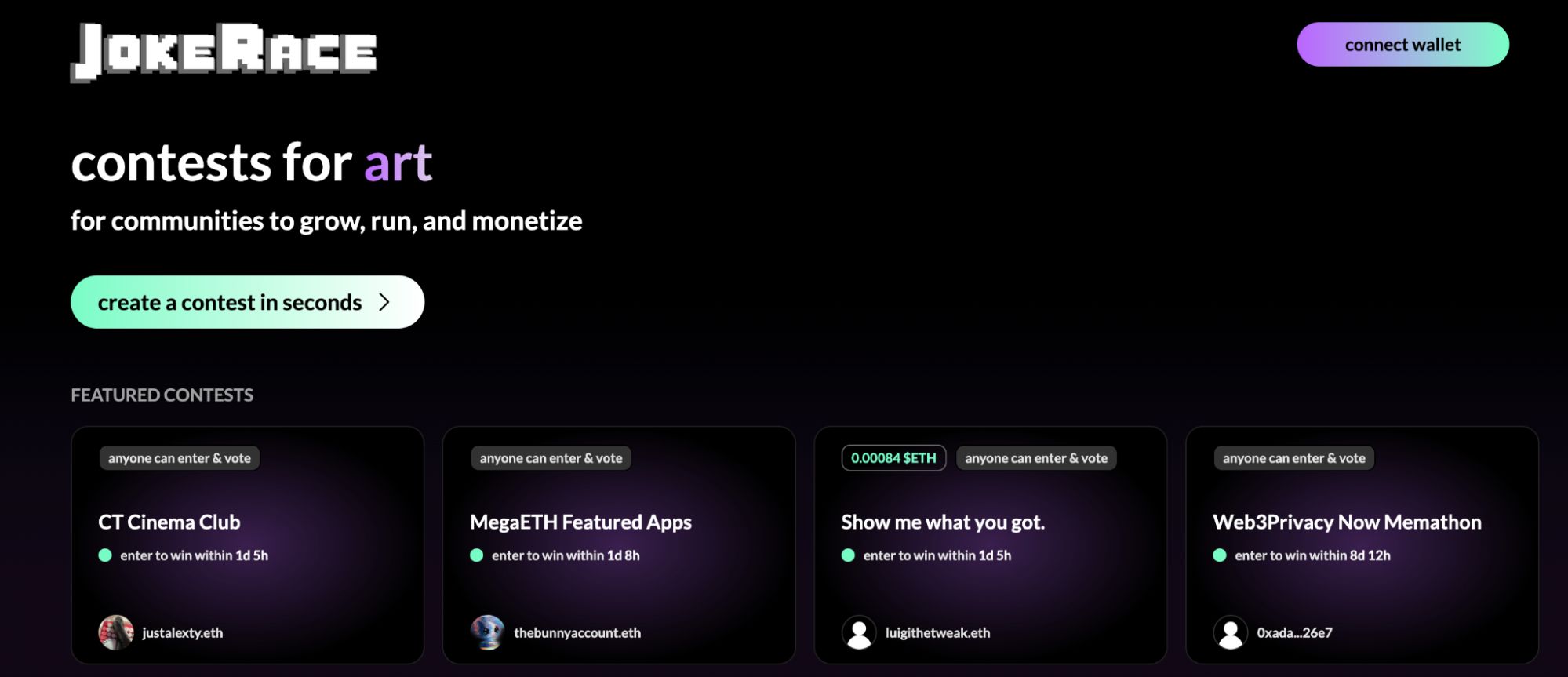 JokeRaceJokeRace 是一个去中心化的社区竞赛平台,专注于通过链上竞赛和投票机制为用户构建可验证的声誉记录。用户通过参与创意活动(如 meme 创作、设计)积累链上声誉,解锁社区激励、治理权益等机会,同时为 Web3 项目提供透明的用户互动和声誉数据。