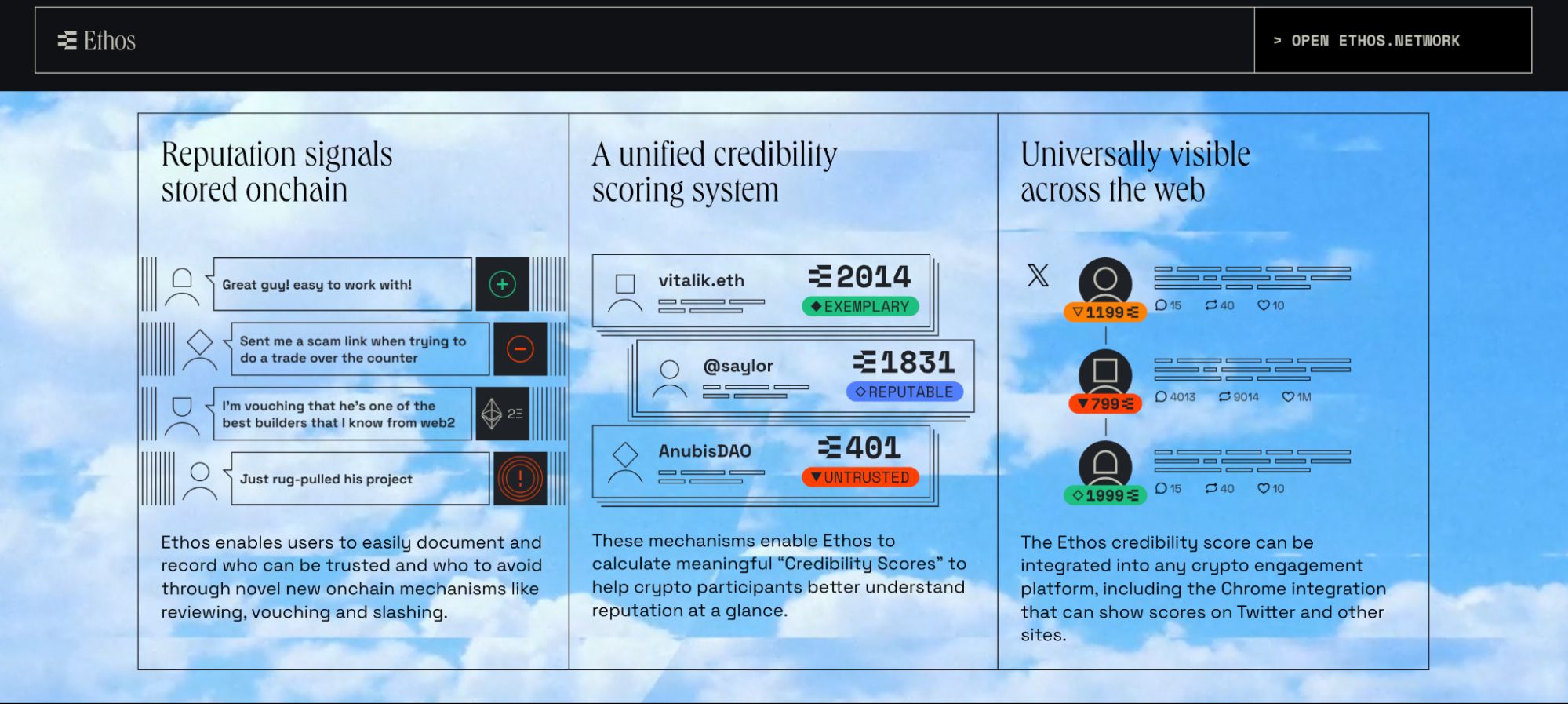 Ethos Network概述:Ethos Network 是一个去中心化的社交和信誉协议,旨在通过链上数据和点对点评价机制,为加密货币生态系统带来更高的信任和可信度。它试图解决加密领域常见的欺诈、退出骗 局等问题,建立一个更透明的生态。