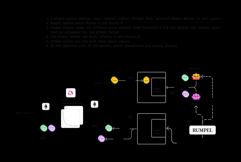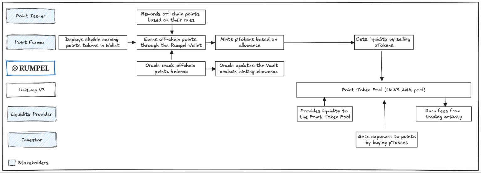 要获取 pTokens,用户首先需要在 Rumpel 钱包中赚取忠诚度积分。这些积分随后会经过 Rumpel Oracle 验证并铸造,使用户能够根据其累积的积分铸造 pTokens。完成后,用户可以在 DEX 上交易 pTokens,从而减少未来空投相关的问题。