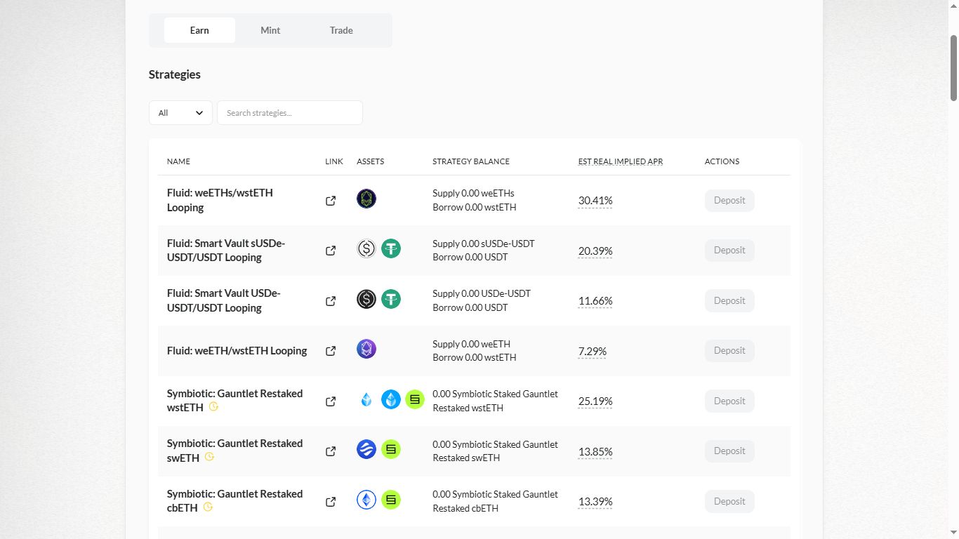 通过赚取功能,用户可以对其积分应用不同的策略以赚取额外收益。不同的代币有不同的策略,并提供不同的年化收益率(APR)。这些策略包括提供流动性、借贷等,以最大化存入资产的使用价值。例如,用户可以存入 weETH,以其为抵押借款,然后再投资,以放大收益。