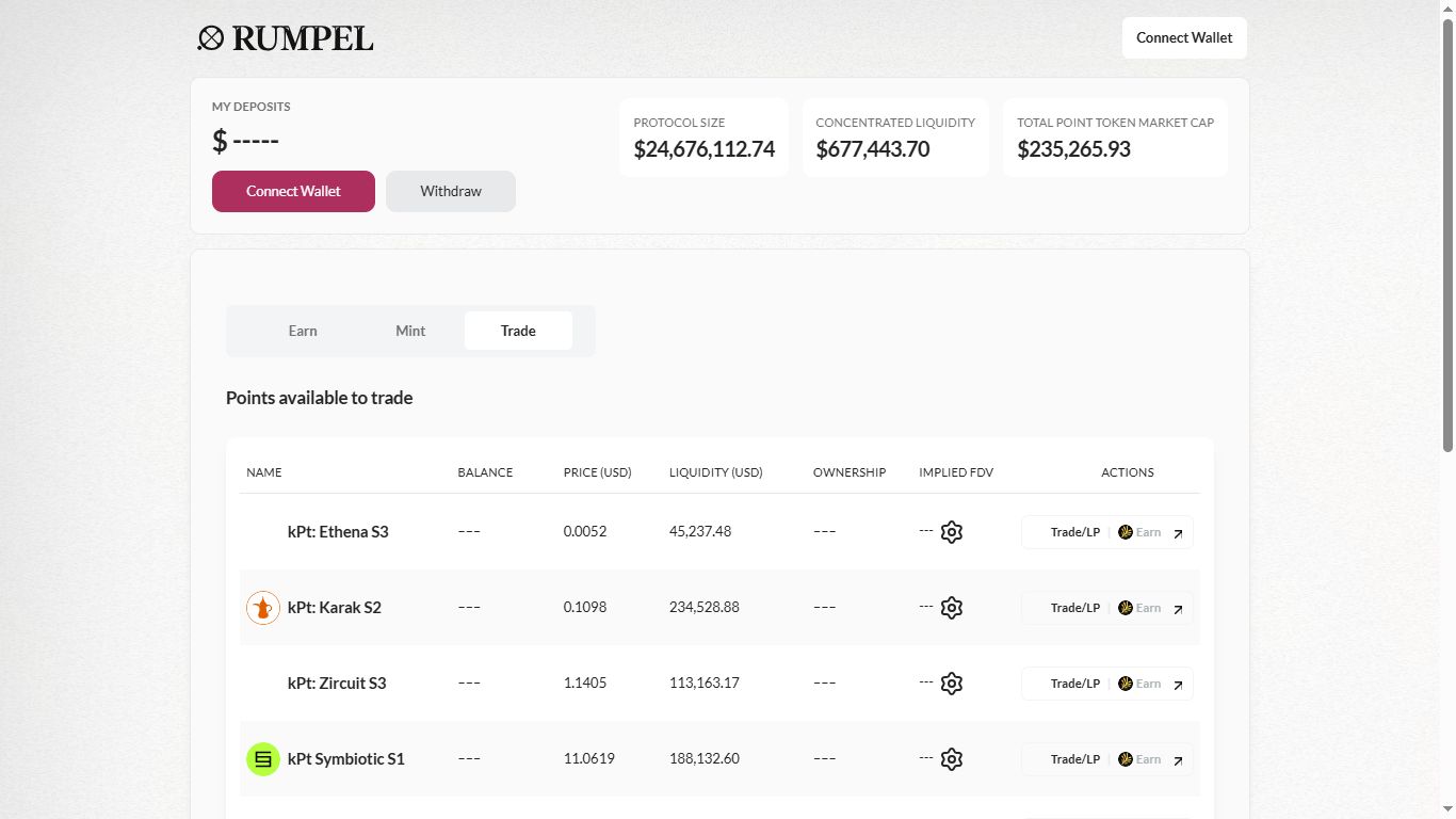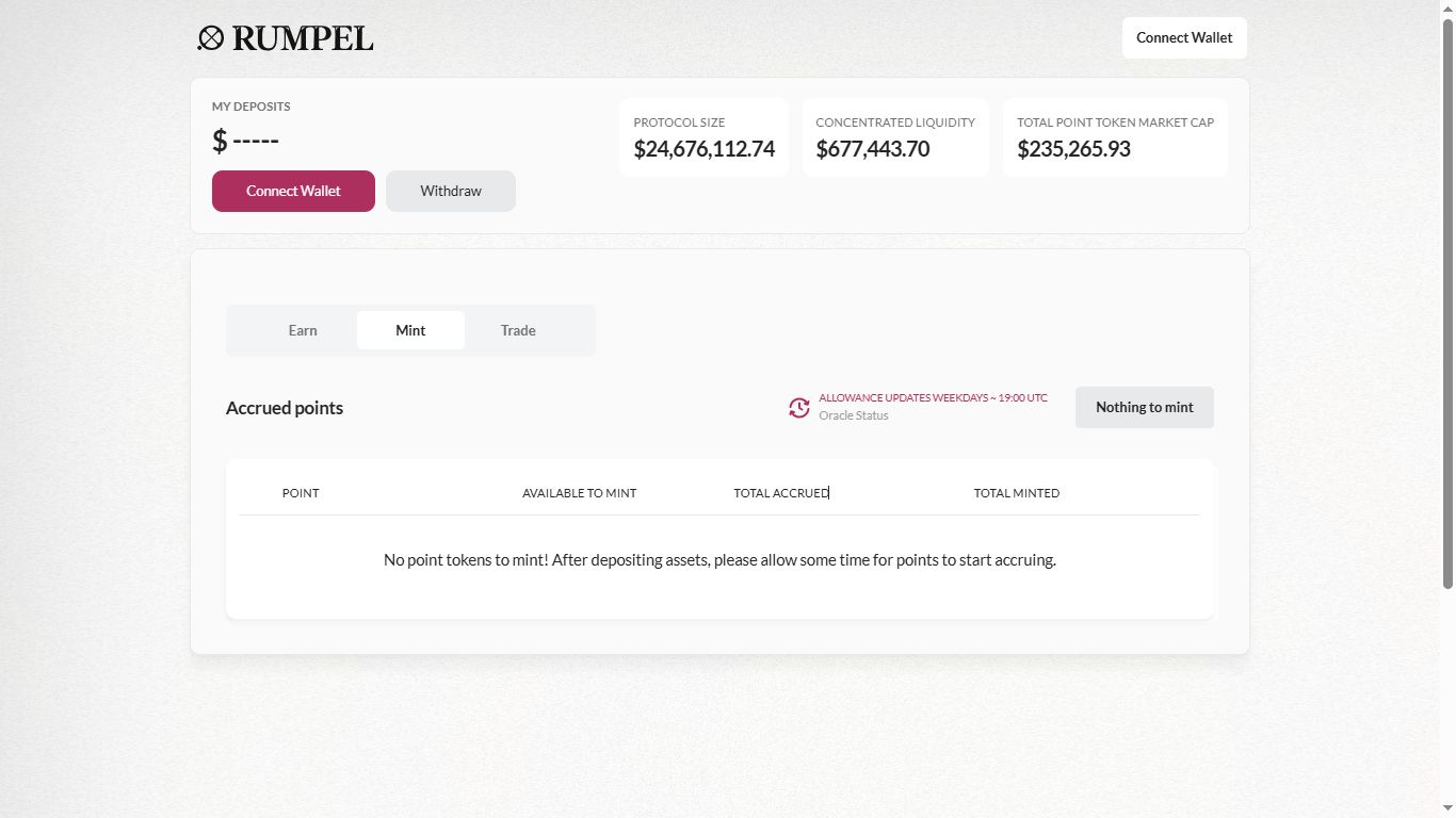 Rumpel App 是一个用户可以连接钱包并自由使用其忠诚度积分的中心平台。该平台为用户提供了三个主要功能:赚取(Earn)、铸造(Mint)和交易(Trade)。