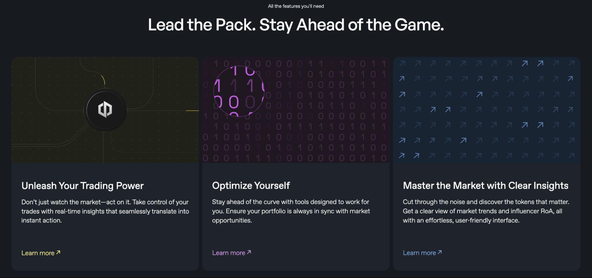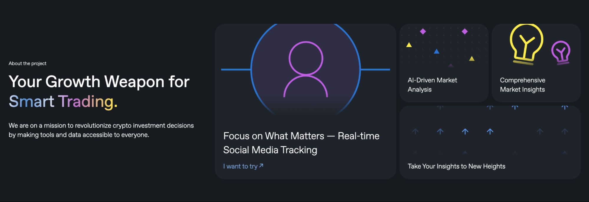 该平台专注于解决加密投资中的常见挑战,如市场波动、信息过载以及来自不可靠来源的虚假信息。它利用机器学习和 AI 算法筛除无关数据,突出关键趋势,并基于历史模式提供预测。