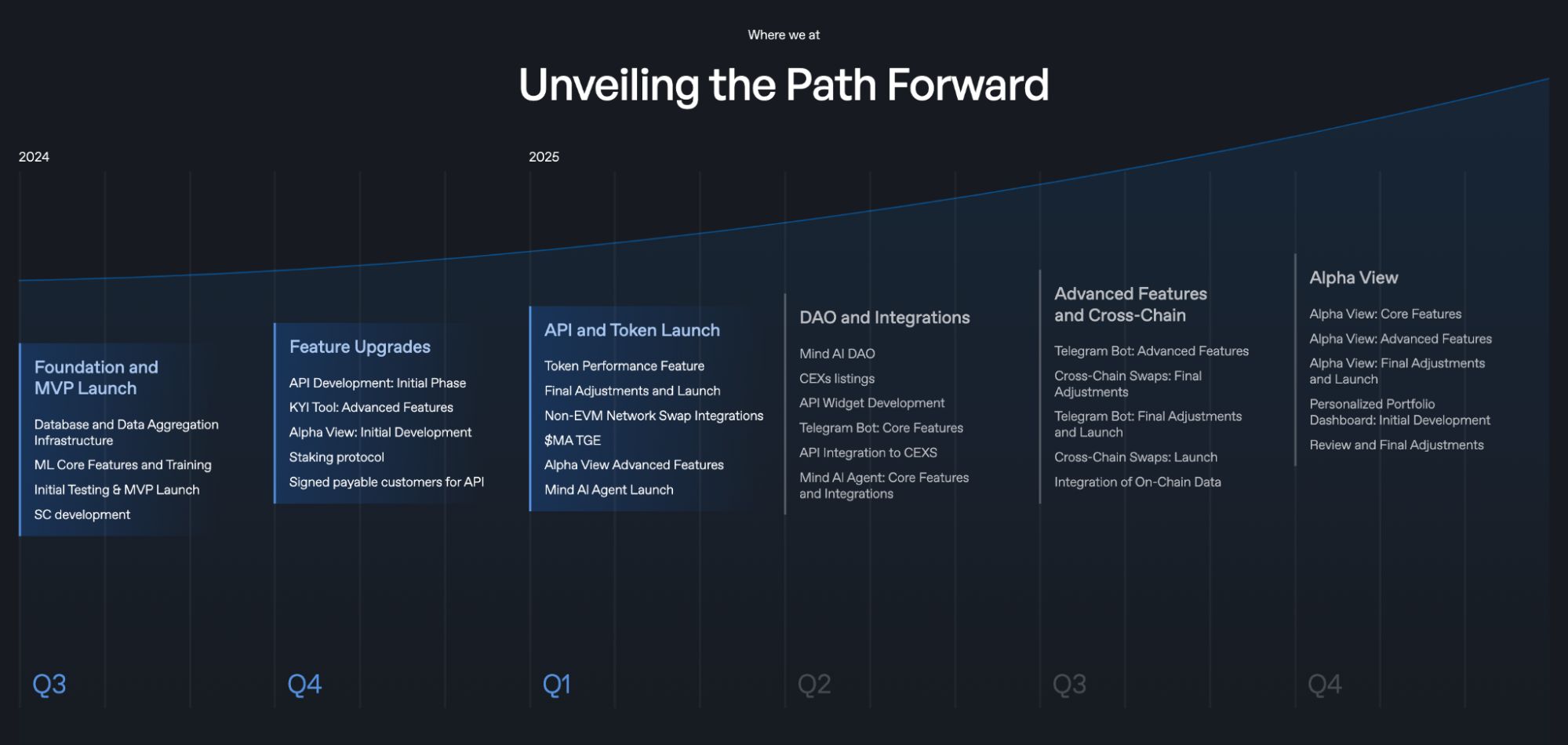 Mind AI 的发展路线图明确了清晰的里程碑,重点是扩展功能、推出 DAO 治理、集成跨链能力,并通过 AI 驱动的工具改善用户体验。该项目的成功将取决于用户采用率、持续开发以及市场环境。