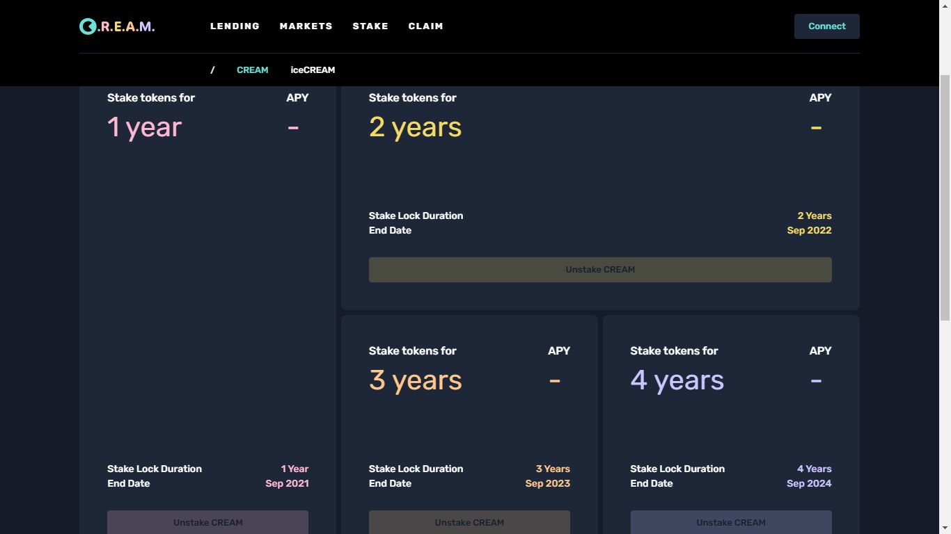 用户可以利用这一功能赚取被动收入。然而,质押资产存在损失的风险。如果 CREAM 的市场价值下跌,用户将面临损失。