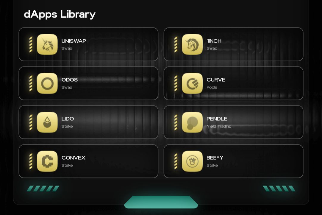 Hinkal 与流行的去中心化应用(dApp)集成,使用户能够执行私密操作,如交换、质押和收益耕作。dApp 库提供便捷访问以下平台: