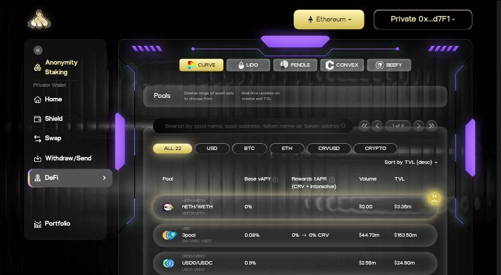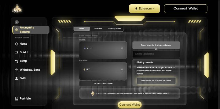 这个去中心化应用(dApp)让用户将资产如 ETH 质押到 Shielded Pool,提升生态系统的隐私性,同时赚取奖励。用户将获得液态隐私代币(例如 hETH),没有锁仓或惩罚,可以在 DeFi 中使用,并收取交易费用的一部分——可以理解为共享隐私而非共享安全,且可跨链扩展。