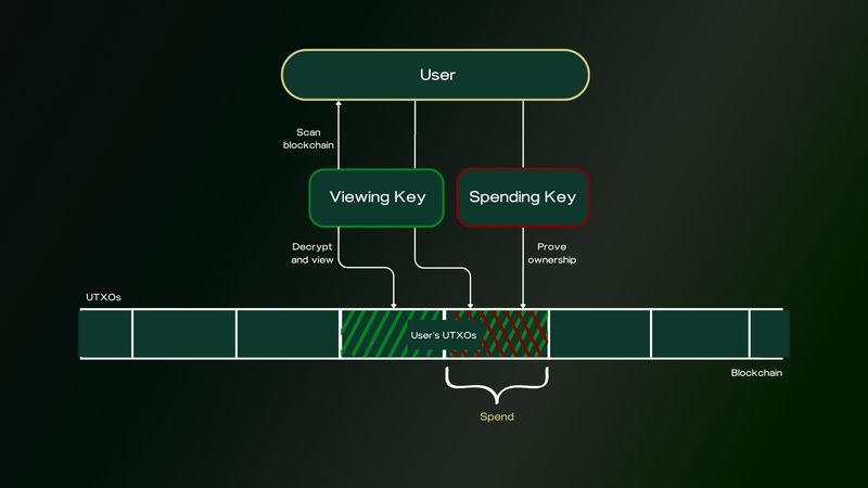 查看密钥对扫描区块链以查找与用户相关的承诺(UTXO),并验证用户是否拥有足够的代币来执行交易。一旦验证通过,就会生成零知识证明,确保交易细节保持隐藏。