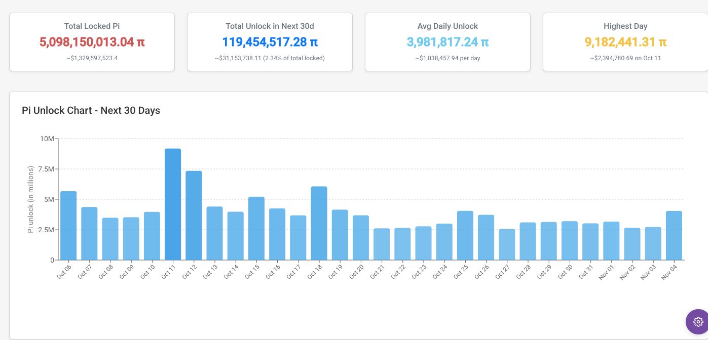 根据 PiScan 的数据,未来 30 天内将解锁约 1.194 亿枚 PI 代币,价值超过 3100 万美元。每日平均解锁量接近 398 万枚 PI,预计 10 月 11 日将出现最大解锁量,解锁量达 918 万枚 PI。