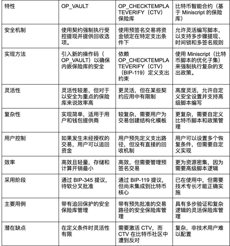 OP_VAULT、OP_CHECKTEMPLATEVERIFY(CTV)保险库和比特币智能合约(基于 Miniscript 的保险库)是几个重点改善比特币用户体验、安全性和资产管理的领先比特币项目,他们致力于提高信任度和普及度。