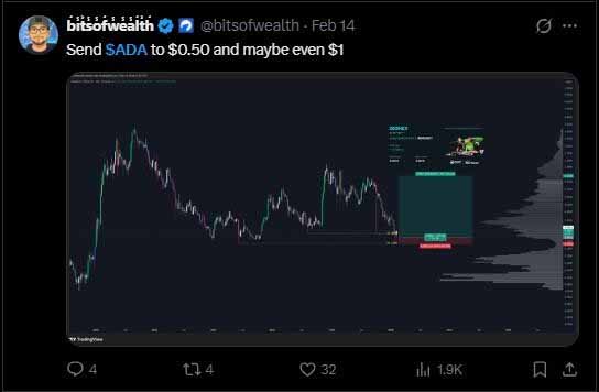 用户 @bitsofwealth 预测,ADA 价格可能会上涨至 0.50 美元,在从关键支撑位反弹后可能继续攀升至 1.00 美元。