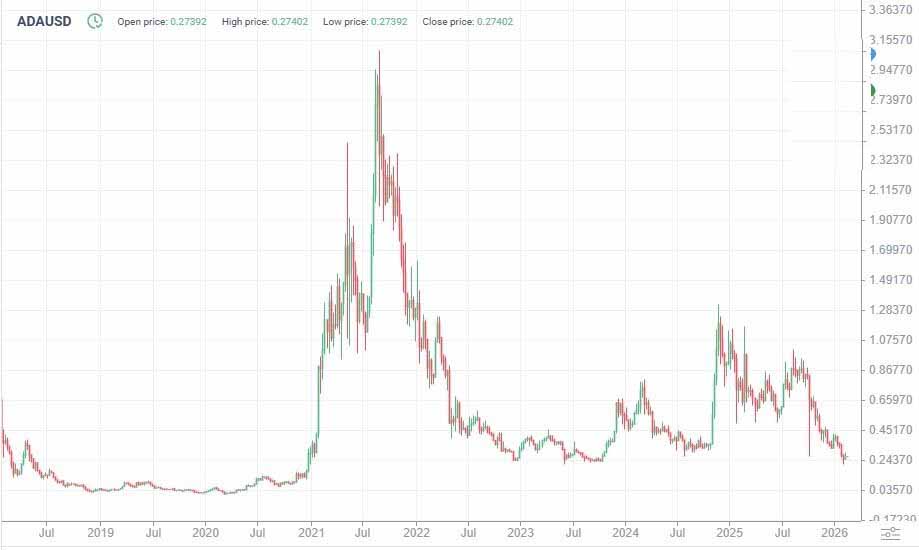 - 2026 年。ADA 价格在经历大幅回调后反弹,交易价格在 0.25 美元至 0.30 美元之间波动。之后,价格在 0.24 美元至 0.35 美元之间波动。