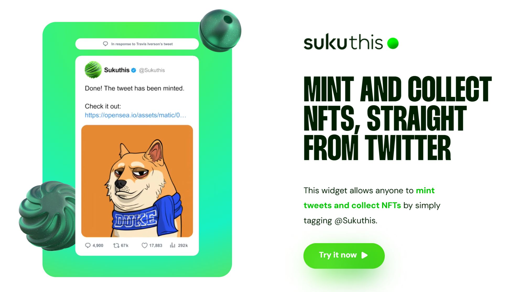 SukuThis 是一款与Twitter集成的工具,允许用户直接从推文中铸造、收集和交易NFT。这一创新功能让任何人只需要在推文中标记 @SukuThis 就能轻松创建NFT,简化了数字资产的制作过程,让它像发推文一样简单。SukuThis旨在去除NFT铸造的复杂性,即使没有加密钱包的用户也能参与到创作者经济中。