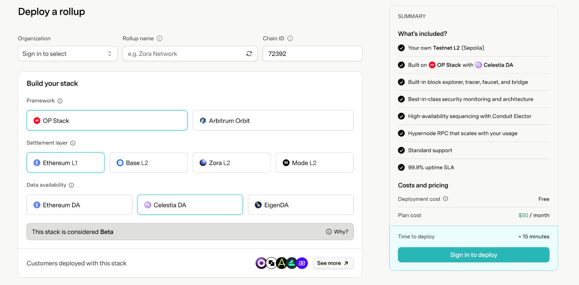 来源:https://app.conduit.xyz/deploy?rollupName=&chainId=72392&withdrawPeriod=600&blockGasLimit=30000000&environment=TESTNET&framework=OPTIMISM&settlement=L1&dataAvailability=CELESTIA