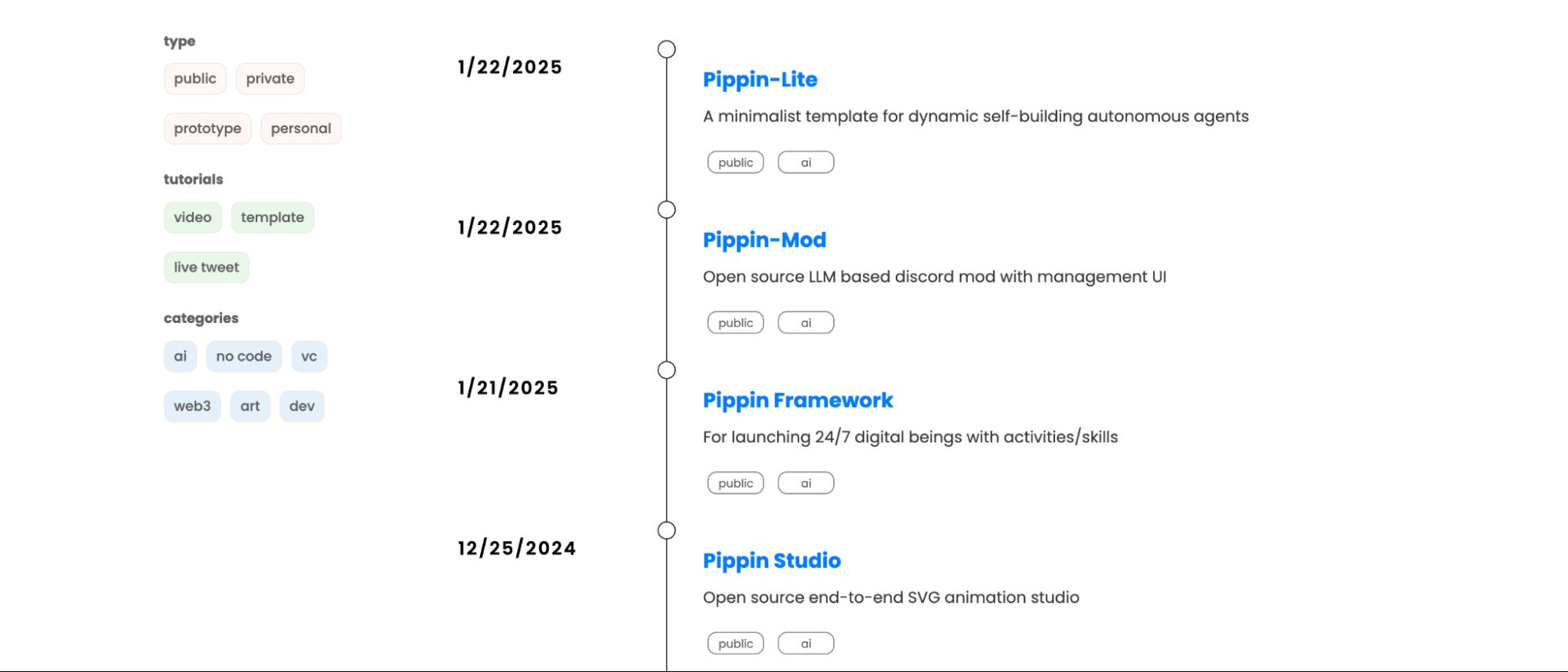 Pippin Studio(2024.12)是开源 SVG 动画工具,Pippin-Lite(2025.1)提供极简 AI 代理模板,Pippin-Mod(2025.1)是基于 LLM 的 Discord 管理工具。