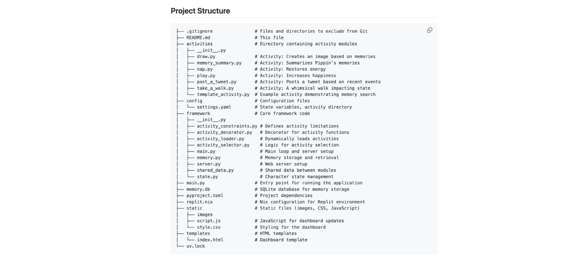活动模块独立,易于添加或修改,并可与Pippin的记忆和状态互动。活动有频率限制等约束,确保行为平衡和真实。实时仪表盘: