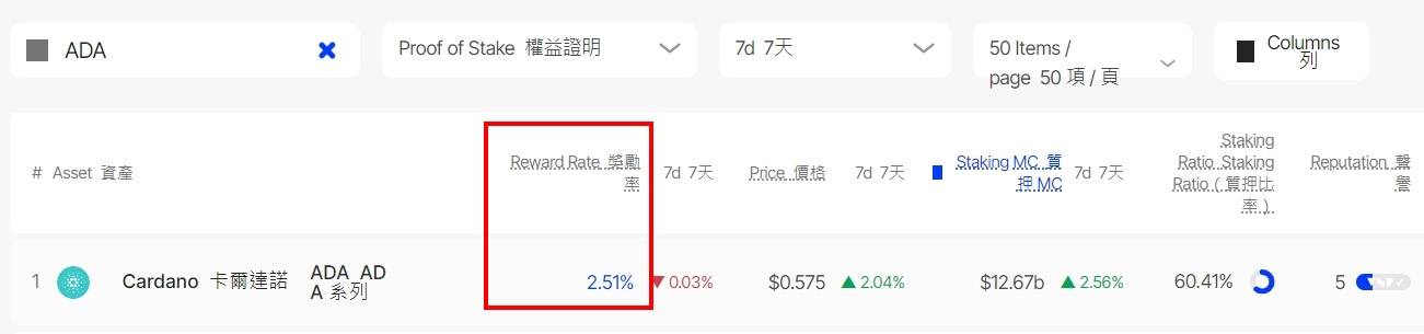 - 根据Staking Rewards,目前质押ADA 约可获得2.63% 年化报酬,全网质押比率约有60%。