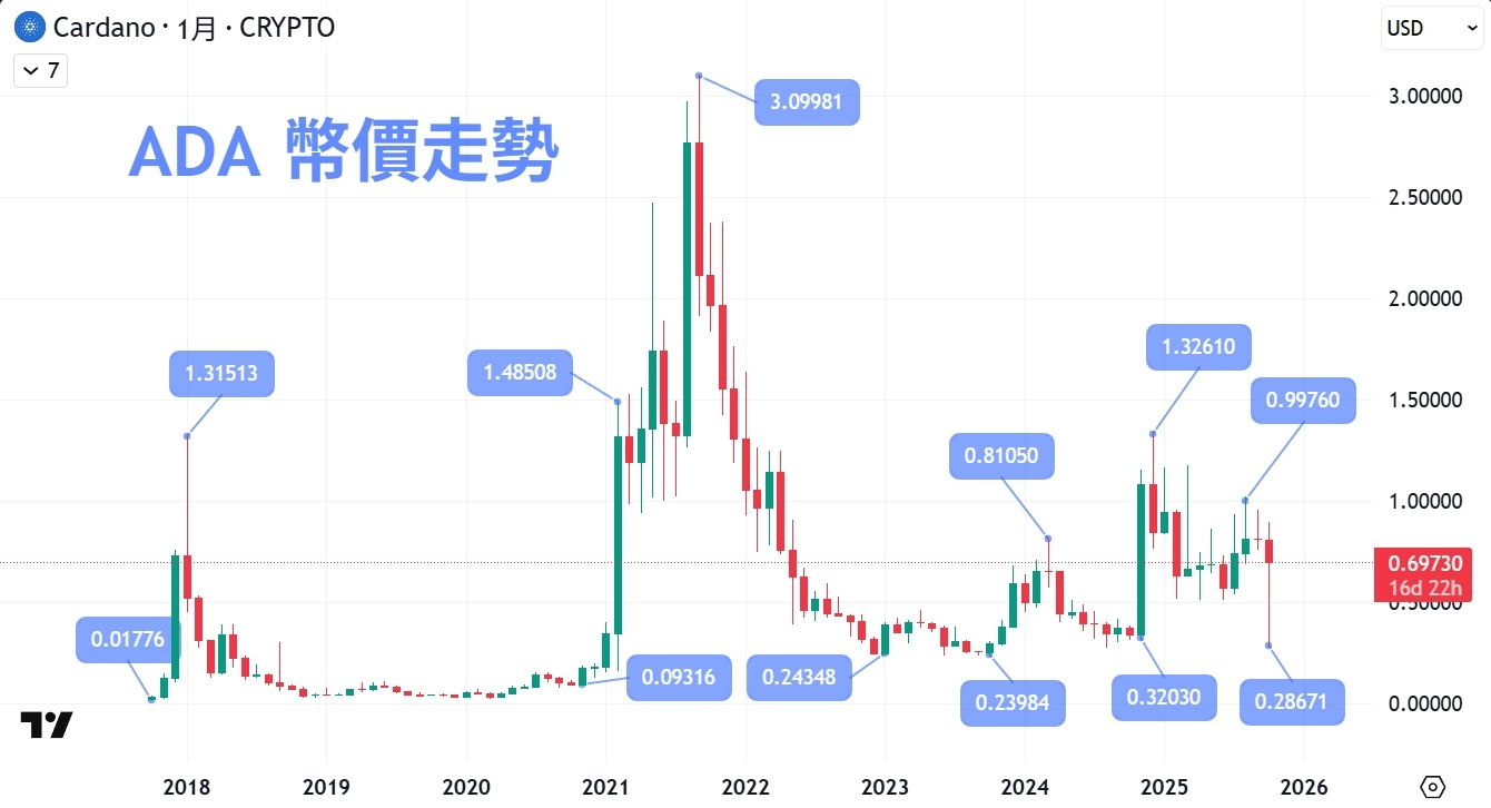 自 2017 年发行以来,Cardano(ADA)历经多轮牛熊循环,价格波动反映市场情绪、政策事件与生态进展。近年走势大致可分为以下阶段: