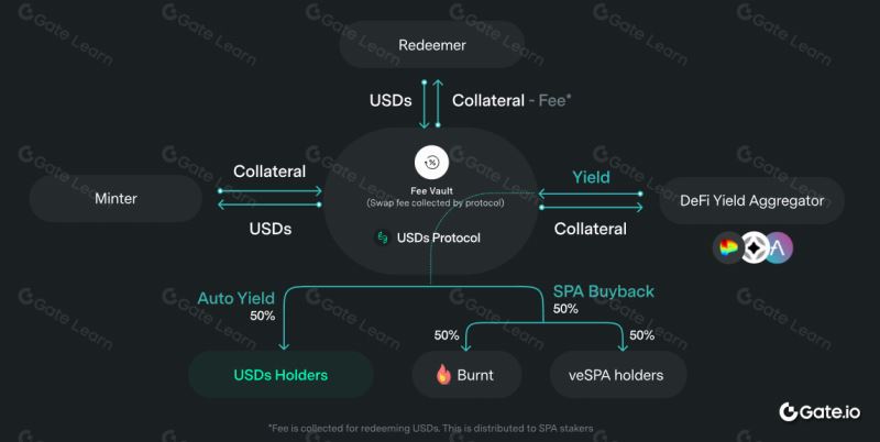 SPA的协议还整合了DeFi收益聚合器,使用户能够自动化地将资产部署到最具吸引力的收益挖矿机会中。USDs持有者可以通过收益聚合器从协议中获得被动收入,收益聚合器会将锁定的抵押品投资于高回报的收益挖矿项目。