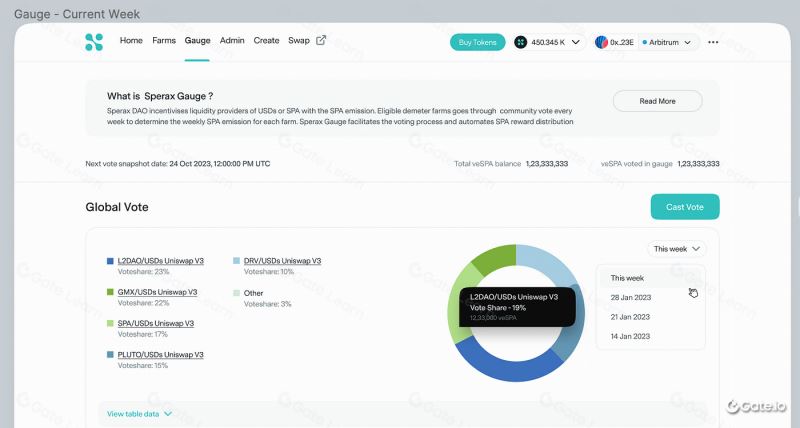 - Gauge投票:veSPA持有者参与每周投票,决定向每个池分配多少SPA奖励。用户可随时投票,但链上快照将在每周四12:00:00 UTC进行。