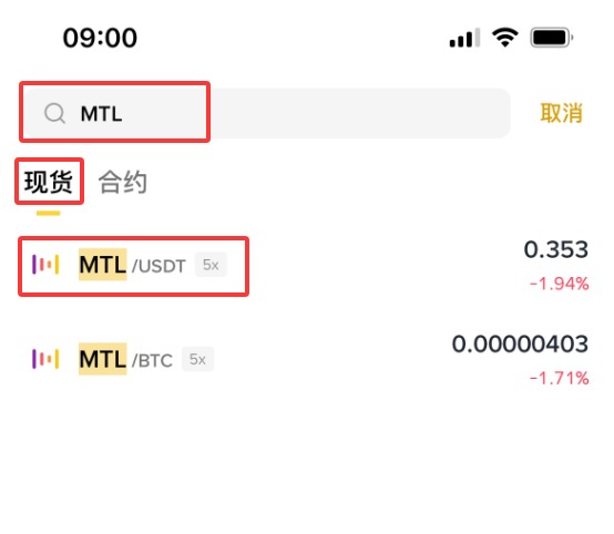 3、输入【MTL】,这时下拉会显示【现货】【MTL/ USDT】,点击【MTL/ USDT】。(作为新手,不建议做合约,所以这里就不演示合约购买方式了。)