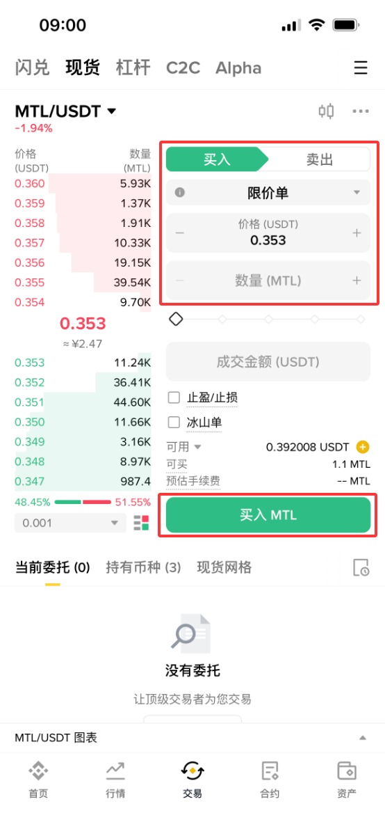 5、依次选择【限价单】-购买【价格】-购买【数量】-【成交数量】,设置好之后,点击【买入MTL】。