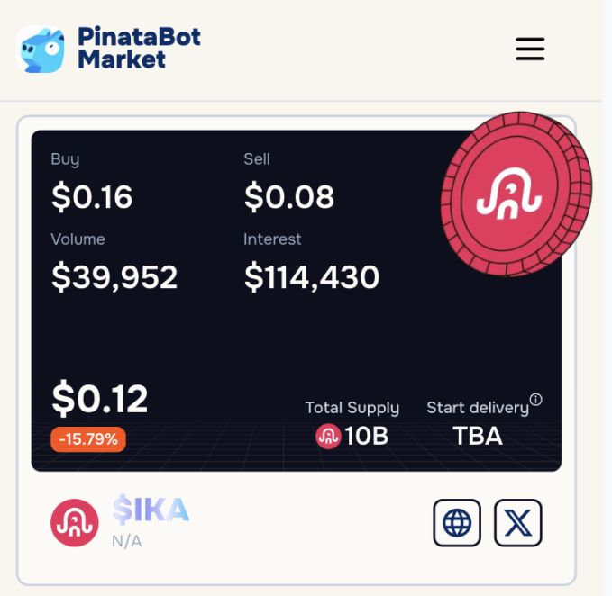 截至目前,项目最高融资估值为 6 亿美元。而在 Sui 的盘前代币 OTC 交易市场 PinataBot Market 上,代币 IKA 的全流通市值已达 12 亿美元(成交量较低)。