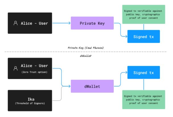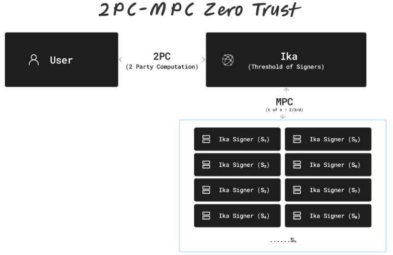 IKA 的核心技术可归纳为两大模块——dWallet(去中心化钱包)与 2PC-MPC(两方计算 - 多方安全计算)协议,让用户无需依赖封装代币,可直接使用 BTC、ETH 等原生资产参与多链生态。