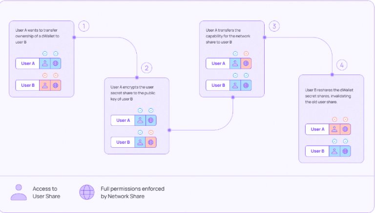 dWallets 如同跨链世界的「万能 钥匙」:用户通过一个界面即可管理多链资产。每个 dWallet 的私钥被拆分为多份「密钥份额」,分布存储在网络中的不同节点。用户发起跨链交易时,网络节点与用户各自持有的一份密钥份额共同参与签名运算,却从不重构完整私钥。这意味着任何情况下都不存在单点私钥泄露风险。