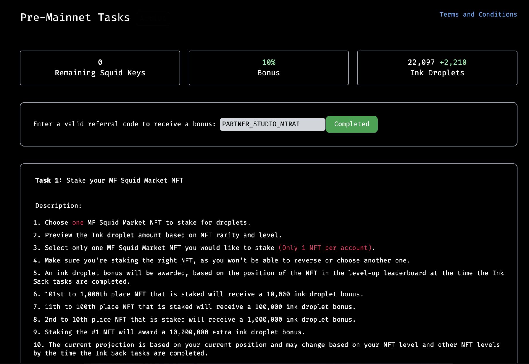 许多任务需要质押其在 Sui 上发行的· THE MF SQUID MARKET 系列 NFT (目前地板价为 87 SUI)才能参加。
