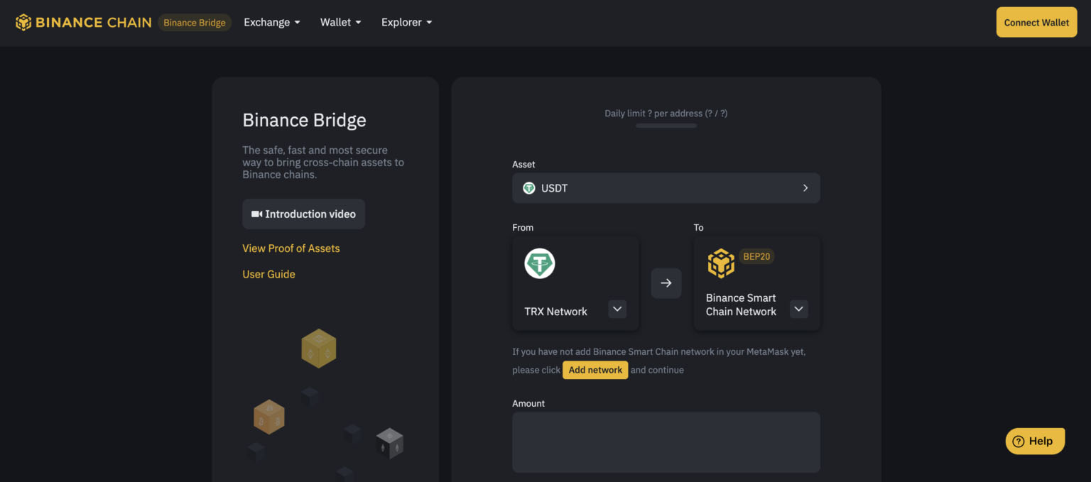 另一种入金方式是币安桥,尤其是当使用者的资产不在币安交易所。藉由币安桥的方式,使用者可以选择代币所在的公链,像是以太坊或是波场(TRON),将公链上的代币转成BSC 上的封装代币。
