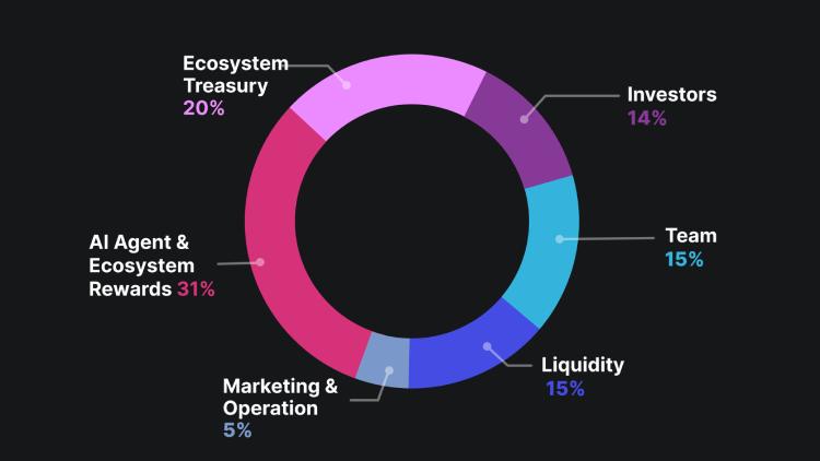 总供应量中,71% 用于生态系统和社区发展。其中,31% 用于 AI 代理奖励和生态系统激励,15% 用于流动性,20% 用于生态系统金库,5% 用于市场营销和运营。剩余 29% 分配给团队,15% 分配给团队,14% 分配给投资者。