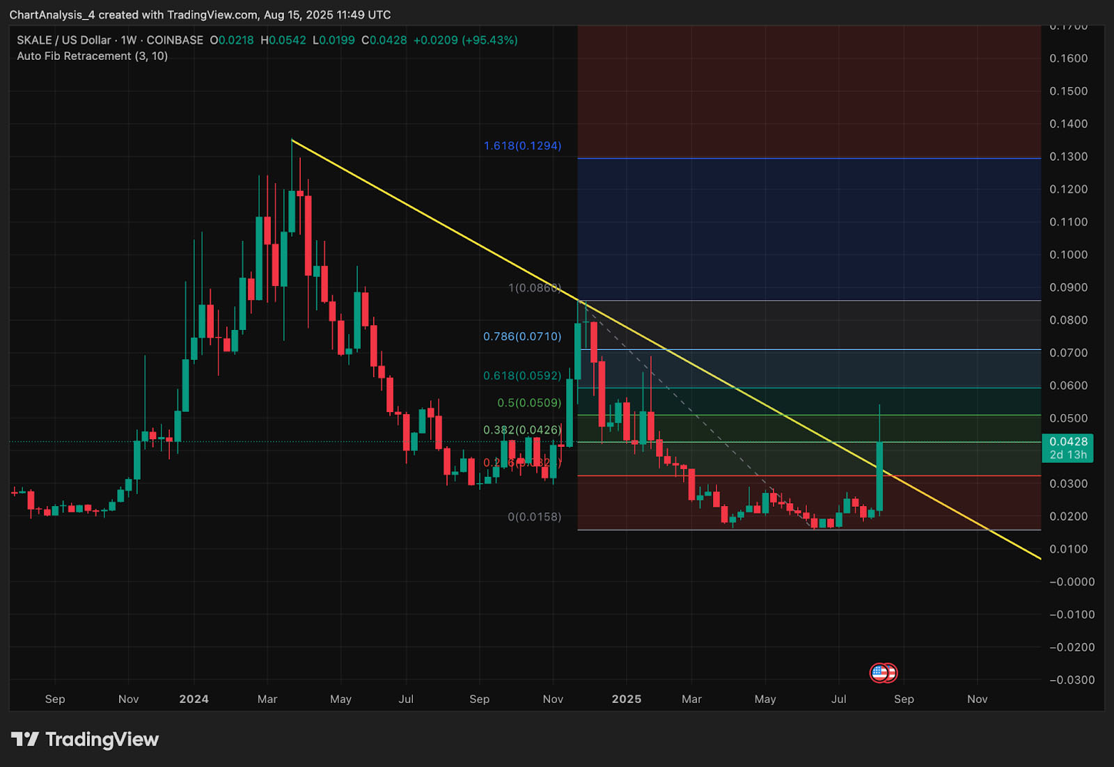SKL 目前的交投价位在 0.042 美元附近,此前一度飙升至 0.0515 美元上方,并短暂突破了 0.5 斐波那契回撤位 0.0509 美元。突破长期下行趋势线和 0.025-0.030 美元附近的关键水平阻力位,已使近期市场人气转向看涨。