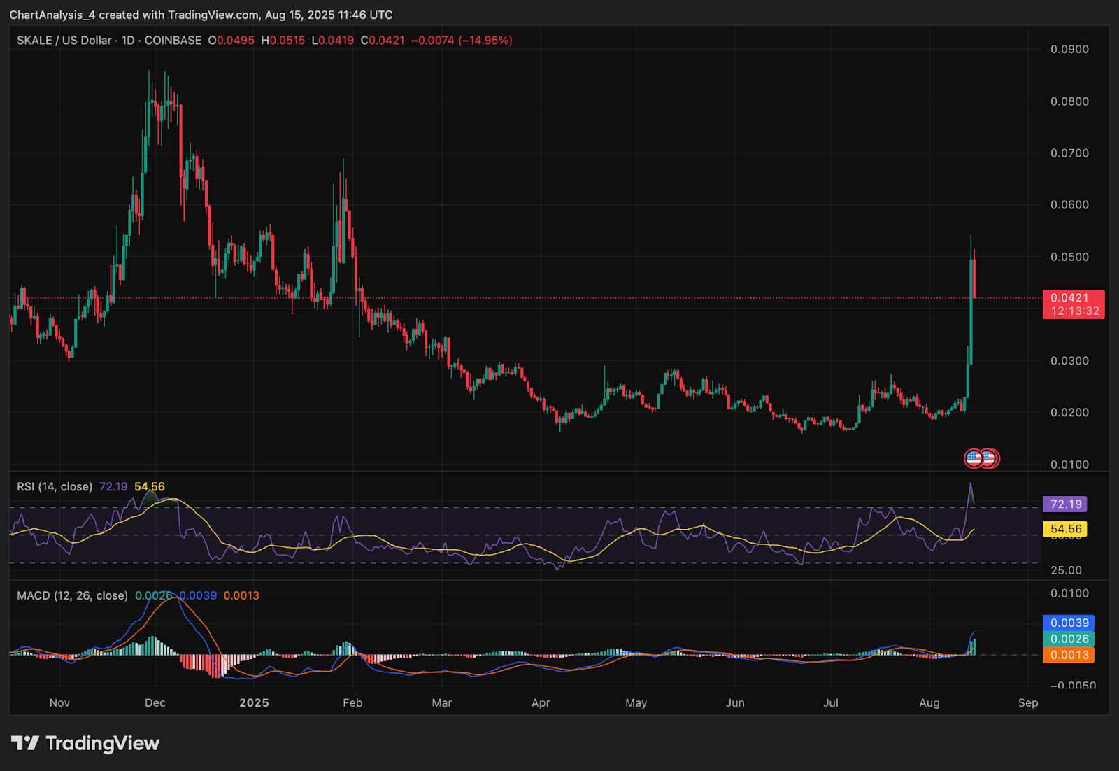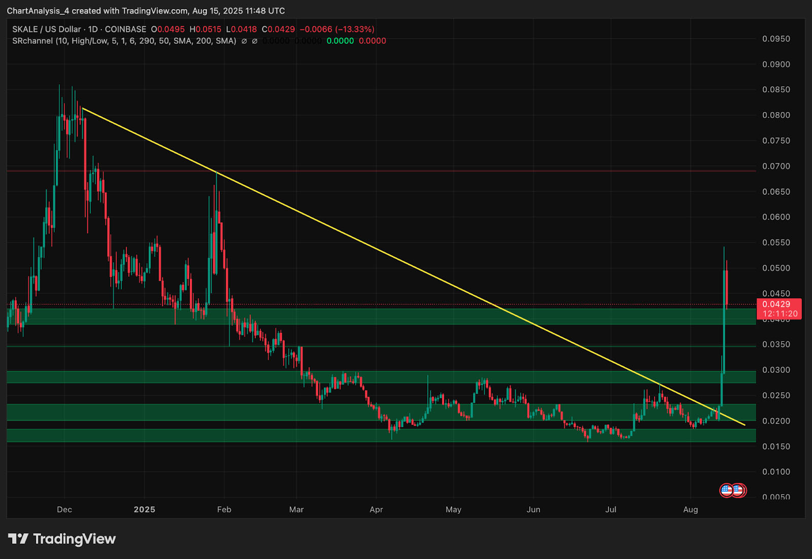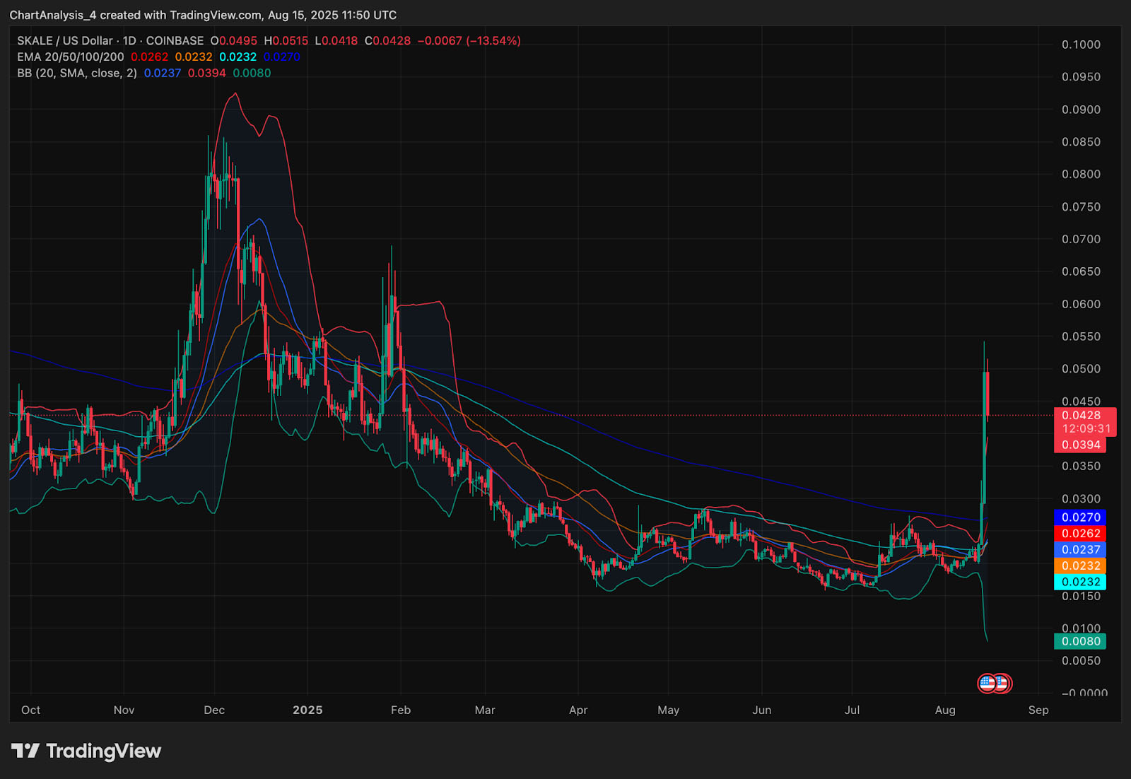 SKALE (SKL) 从 8 月初的低点大幅上涨,突破了持续数月的下降趋势线,并重新测试了关键阻力区。此次突破的支撑因素包括:波动性扩大、强劲的动量指标,以及数月来首次突破主要指数移动平均线 (EMA) 水平。
