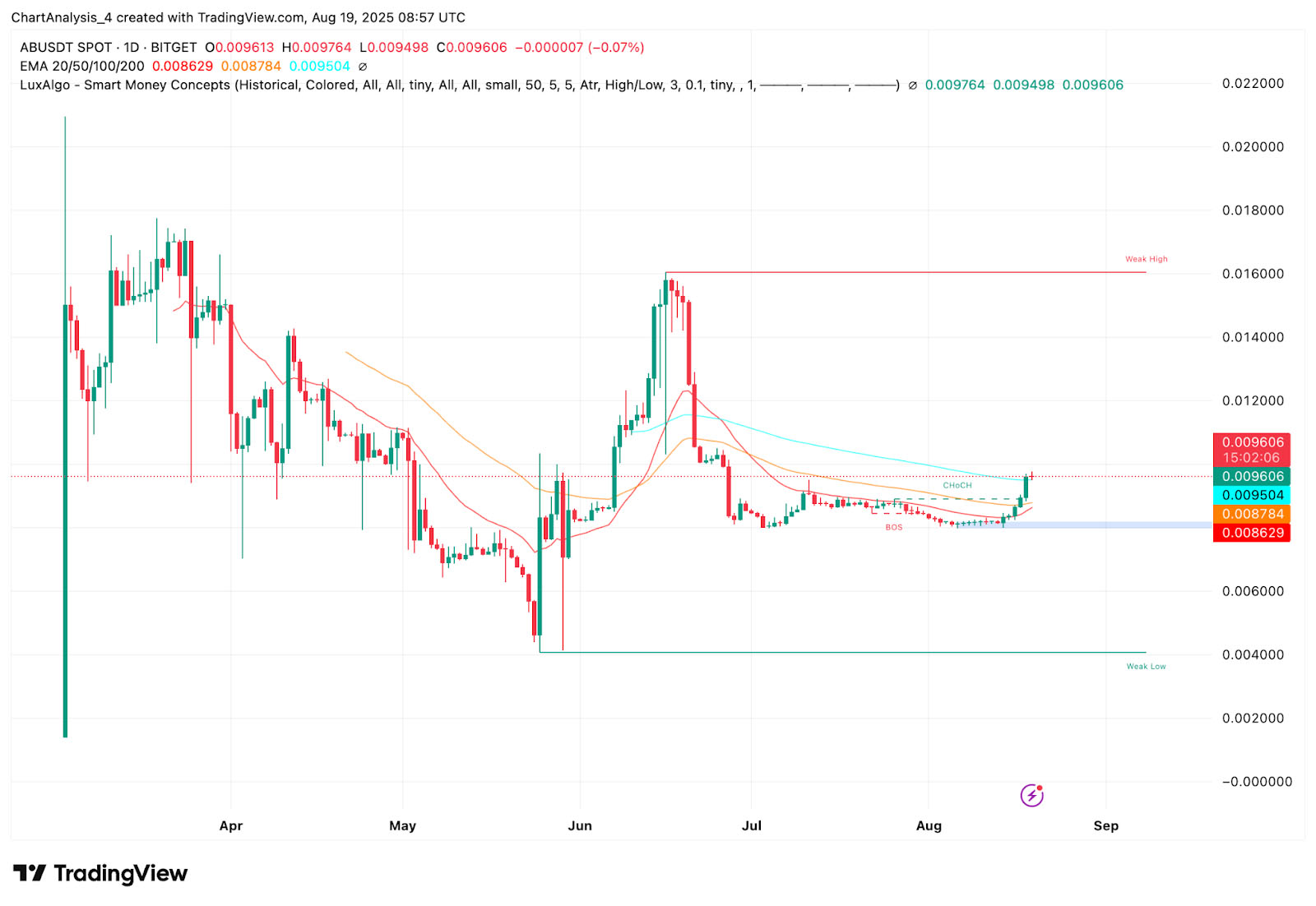 AB 价格目前正挑战 100 日均线 (EMA) 0.00950 美元附近,此前该价格已收复 20 日和 50 日均线 (EMA) 0.00870 美元至 0.00880 美元附近的区域。Smart Money Concepts 指标显示,BOS 和 CHOCH 均线位于近期盘整区域上方,预示着看涨的结构性意图。日线收盘价若能突破 0.01000 美元,将是新一轮上涨趋势的首次确认。