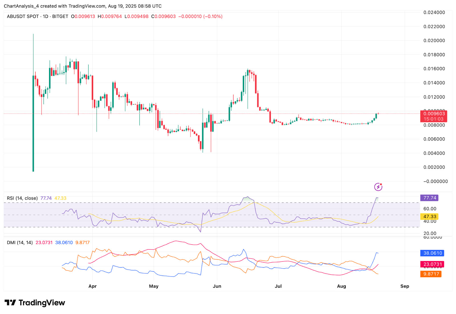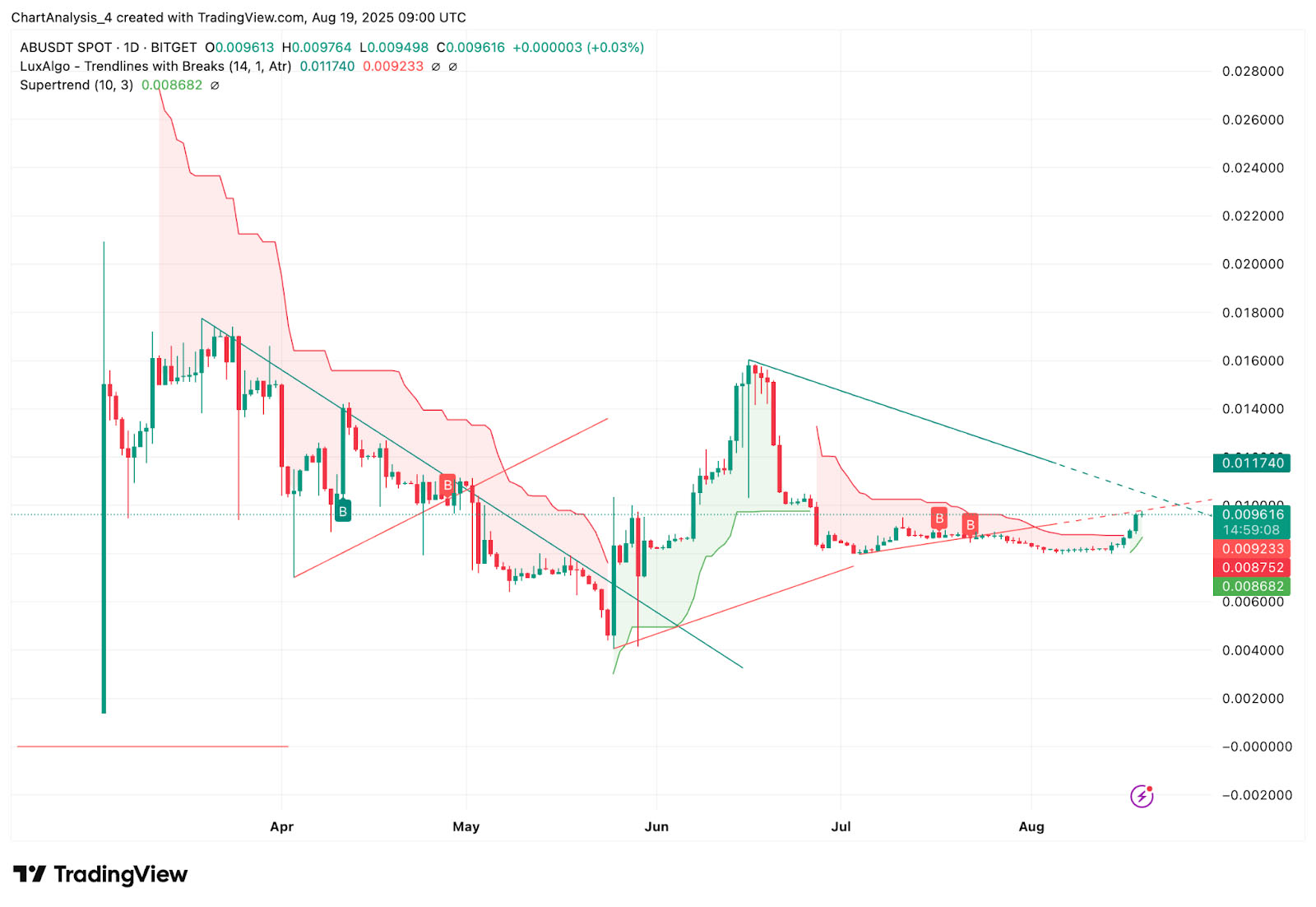 超级趋势指标在 0.00868 美元处转为看涨,建立了关键的尾盘支撑位。突破 0.01170 美元附近的下行趋势线,可能确认结构性逆转,使 AB 价格在 2025 年延伸至 0.01250 美元至 0.01300 美元。