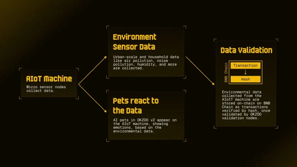 OKZOO 的运作模式结合了AIoT(人工智慧物联网)、GameFi和NFT,形成一个独特的经济闭环。其核心是透过实体装置收集环境数据,并将其与游戏化的虚拟宠物结合,同时以代币作为激励。其运作方式如下: