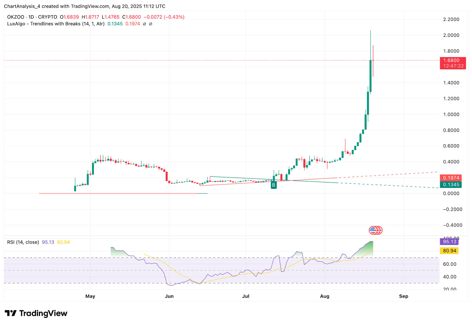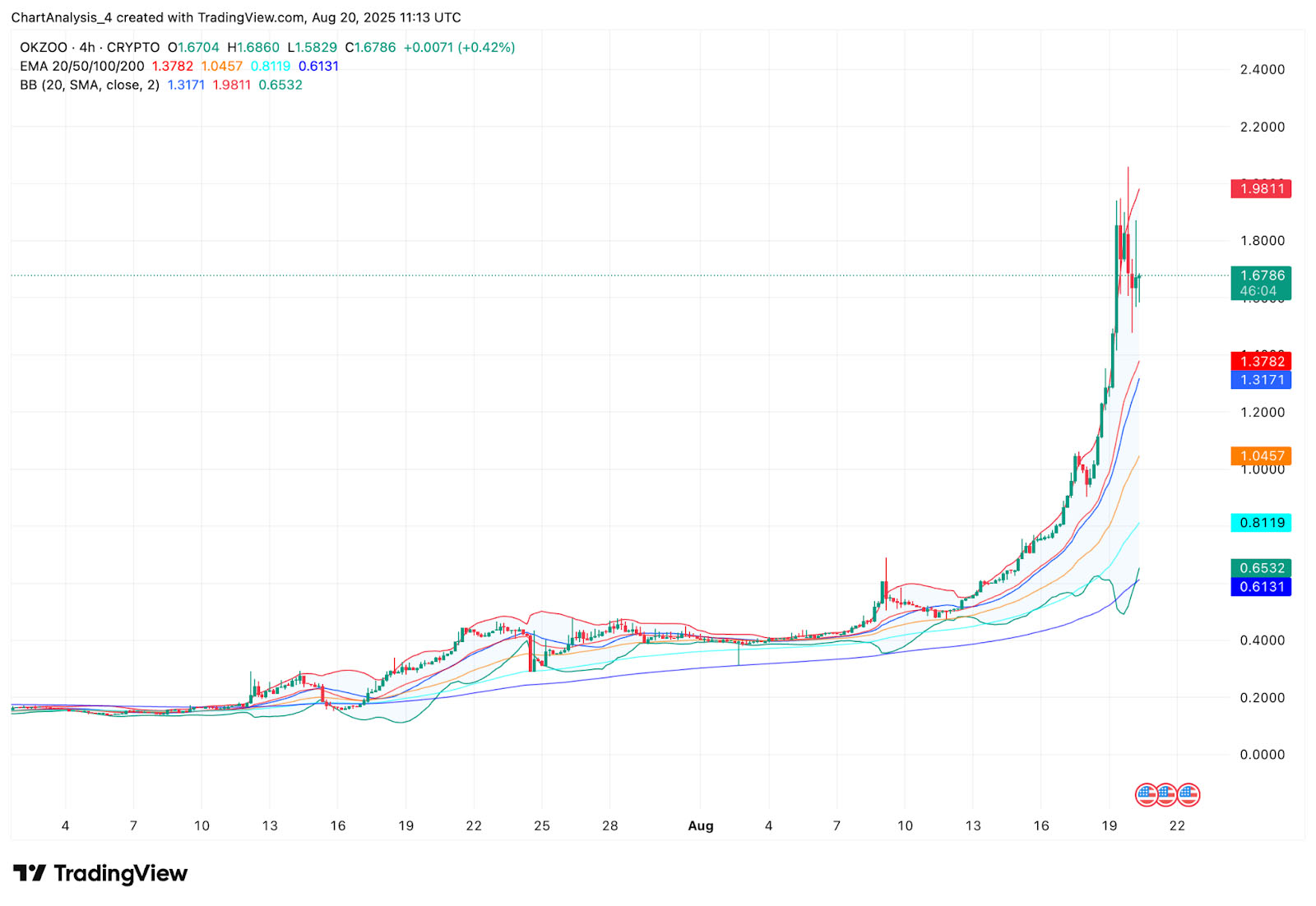 OKZOO (AIOT) 实现了 2025 年以来最强劲的突破之一,从 7 月的不到 0.20 美元飙升至 8 月的 1.66 美元附近。这波上涨推动该代币的 RSI 指标达到极度超买水平,并突破了其完整的 EMA 结构,推动每日布林带创下历史新高。OKZOO 的发行上限为 10 亿,DePIN 模型吸引了超过 1900 万活跃用户,目前值得关注的是,它能否巩固涨势并将收益延续到下一个周期。