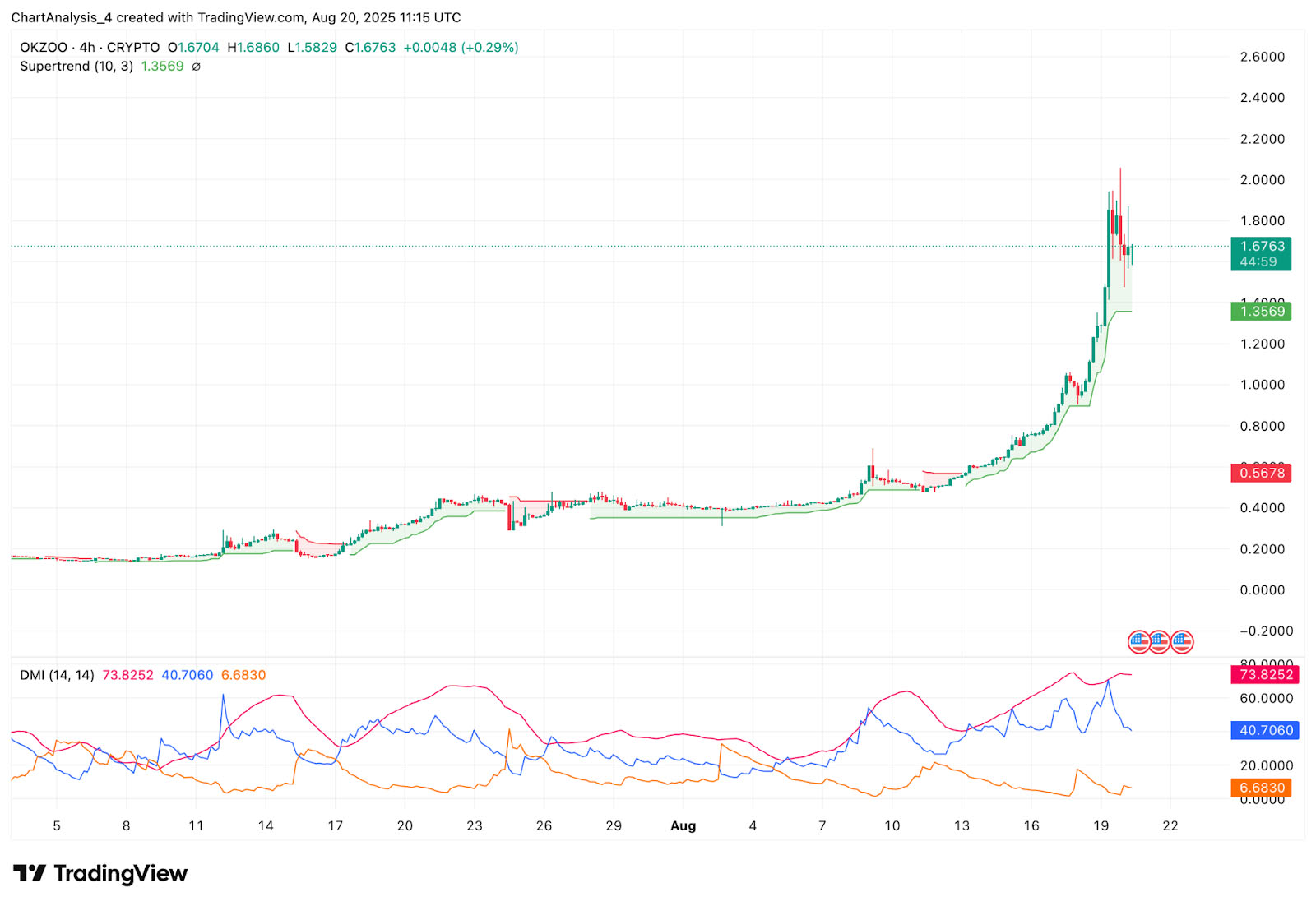 OKZOO (AIOT) 已从一家小型股公司转型为 2025 年增长最快的 DePIN 代币之一,其价格从不到 0.20 美元飙升至近 2.00 美元。看涨的 EMA 走势、超级趋势的确认以及 DMI 的强劲表现,都支撑了其多年的持续发展前景。如果该项目能够持续超过其 1900 万以上的用户群,AIOT 有望在去中心化 AIoT 市场中占据一席之地,其长期目标是到 2030 年达到 10.00 美元。