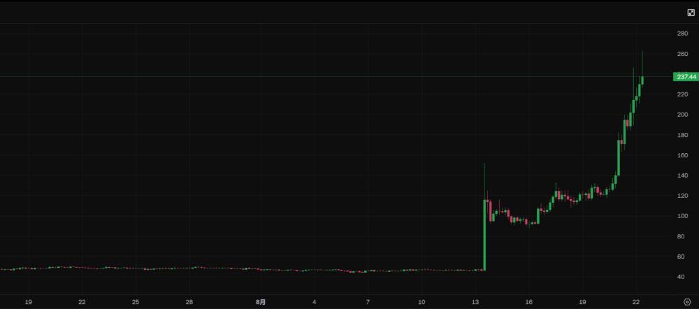 烧毁后,OKB 价格在 24 小时内暴涨 183%,从约 50 美元飙升至 140 美元以上。8 月 21 日,OKB 突破 200 美元关口,创下 239.91 美元的历史峰值;次日(8 月 22 日)继续上攻,市值逼近 40 亿美元。这一连串新高,不仅刷新了 OKB 自身的记录,也带动了其他交易所代币如 BNB 短期反弹。