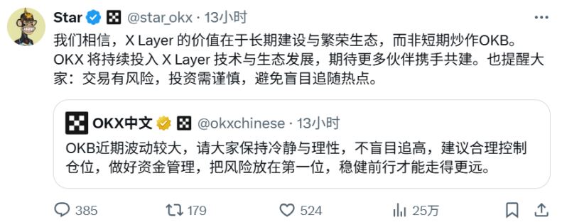 面对价格疯狂上涨,OKX CEO Star 甚至亲自下场发文提醒大家:交易有风险,投资需谨慎,避免盲目追随热点。