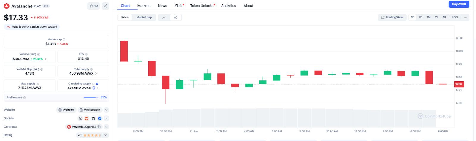 根据Coinmarketcap的数据,Avalanche (AVAX)的当前价格为17.35美元,市值为73.2亿美元,24小时交易量为3.0268亿美元。按市值计算,这种代币是第17大加密货币;它的流通供应量为421,984,696个AVAX代币。最近的统计数据显示,在过去24小时内下降了2.36%,这反映了市场的短期波动性。