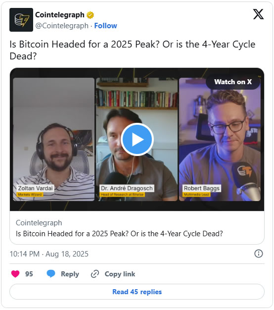 行业观察人士声称,更多资本流入加密市场将推动加密价格上涨。加密资产管理公司Bitwise欧洲研究主管André Dragosch在X平台的"Chain Reaction"节目中告诉Cointelegraph,这可能使比特币价格在年底前突破20万美元。