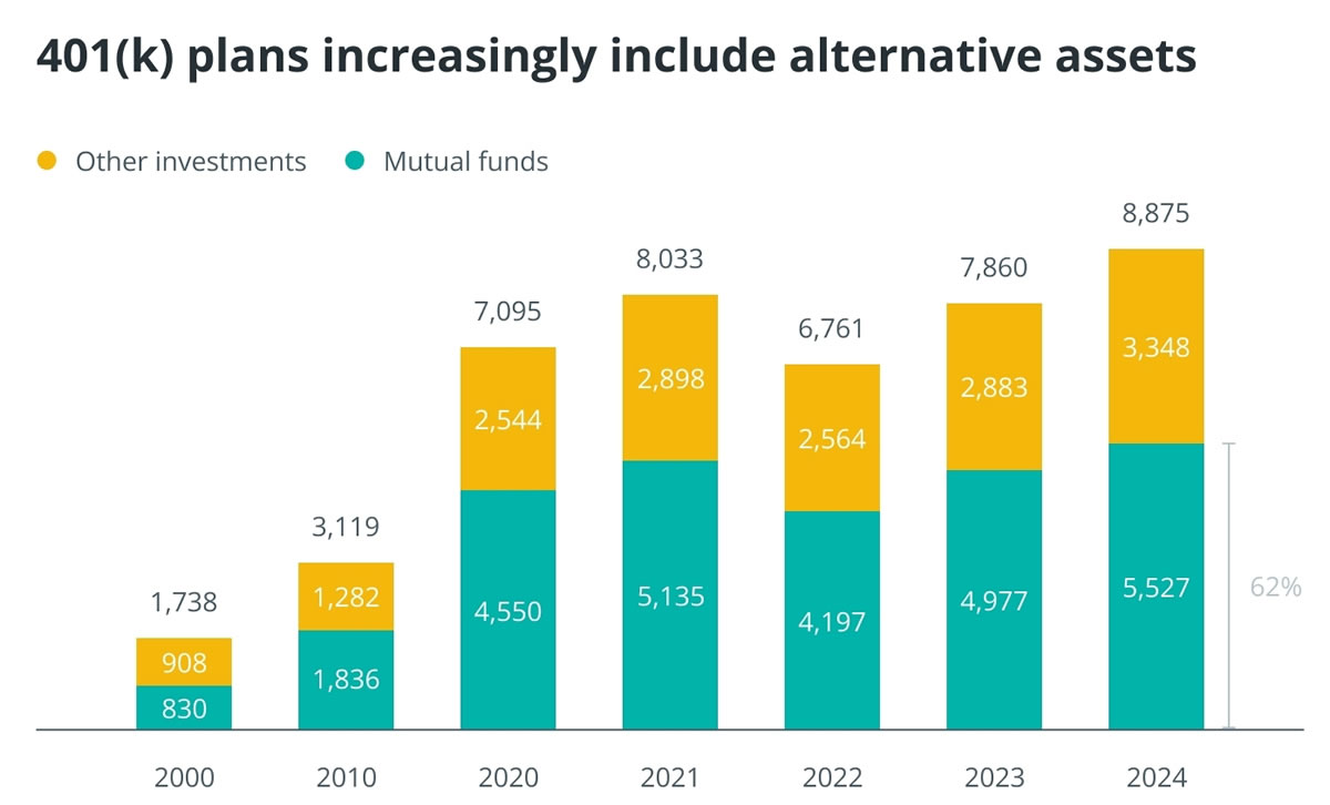 共同基金仍占401(k)计划的大部分,但其他资产正获得越来越多的关注。