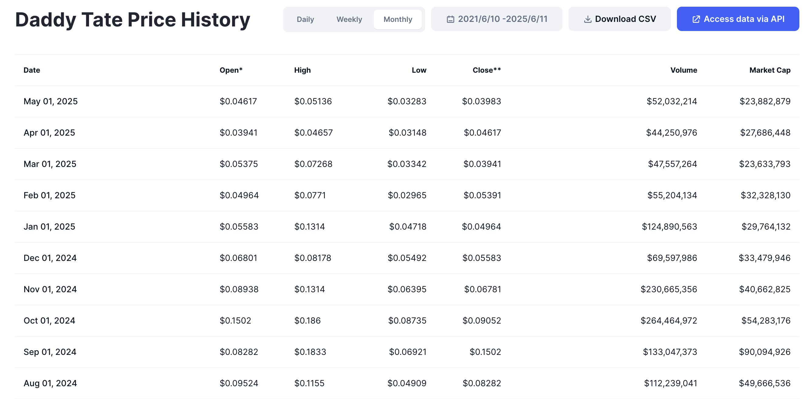 Daddy Tate币(DADDY)在2025年2月10日创下0.03012美元的历史最低价。在撰写本文时,该代币的当前价格(0.03752美元)显示,其价格已从最低点上涨了超过25%。