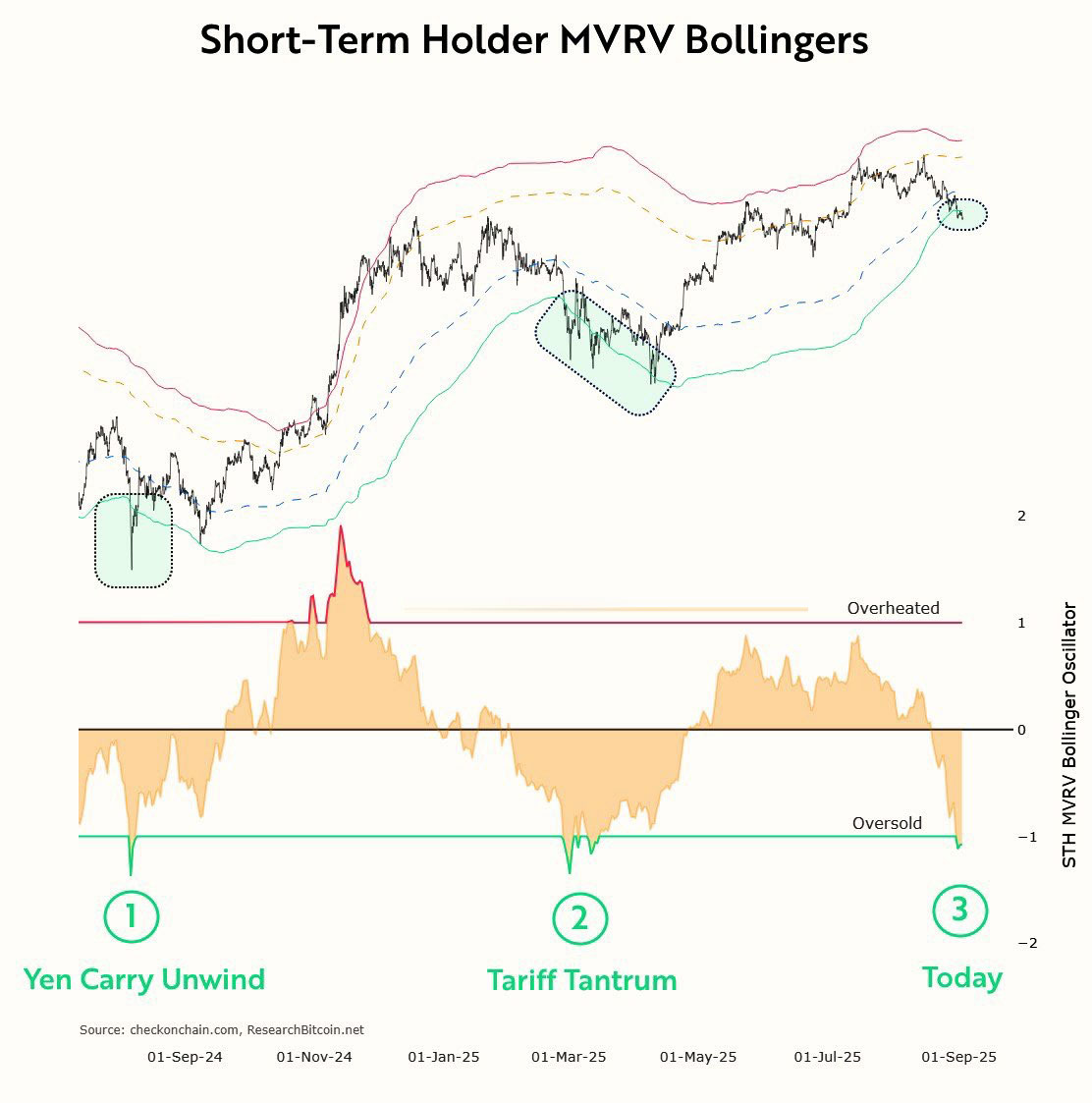 目前,以现价计算,STH群体的MVRV已处于盈亏平衡点。然而,Fetter指出,将布尔带波动性指标纳入分析后,出现了关键的“超卖”信号。