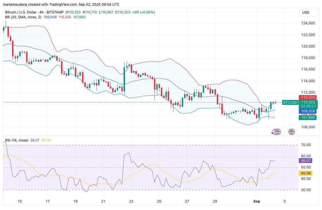 BTC/USD四小时图表与RSI、布尔带数据。来源:Cointelegraph/TradingView