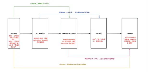 即便解决了资产问题,在我国现有的环境下,发行RWA也并非是一件易事。当前,由于RWA自有的证券属性,发行RWA的流程既涵盖法律合规,又兼具技术复杂度。以赴港发行自有RWA为例,在最初的资产筛选中就要明确资产清晰,具备可交易基础,在通常做法中,还应设立特殊SPV实体以链接境内境外,打通资金与资产的跨境合规流转信道,并在香港完成牌照申请与沙盒测试。在确保合规环节无误后,技术实现上要确保数据与资产的可交互性,现已有完整的解决方案提供商可提供此类方案,技术重点在于资产上链、智能合约审计以及跨链互通方面。而从整个流程而言,若仅依托自有企业赴港发行RWA,耗时至少超过8个月。